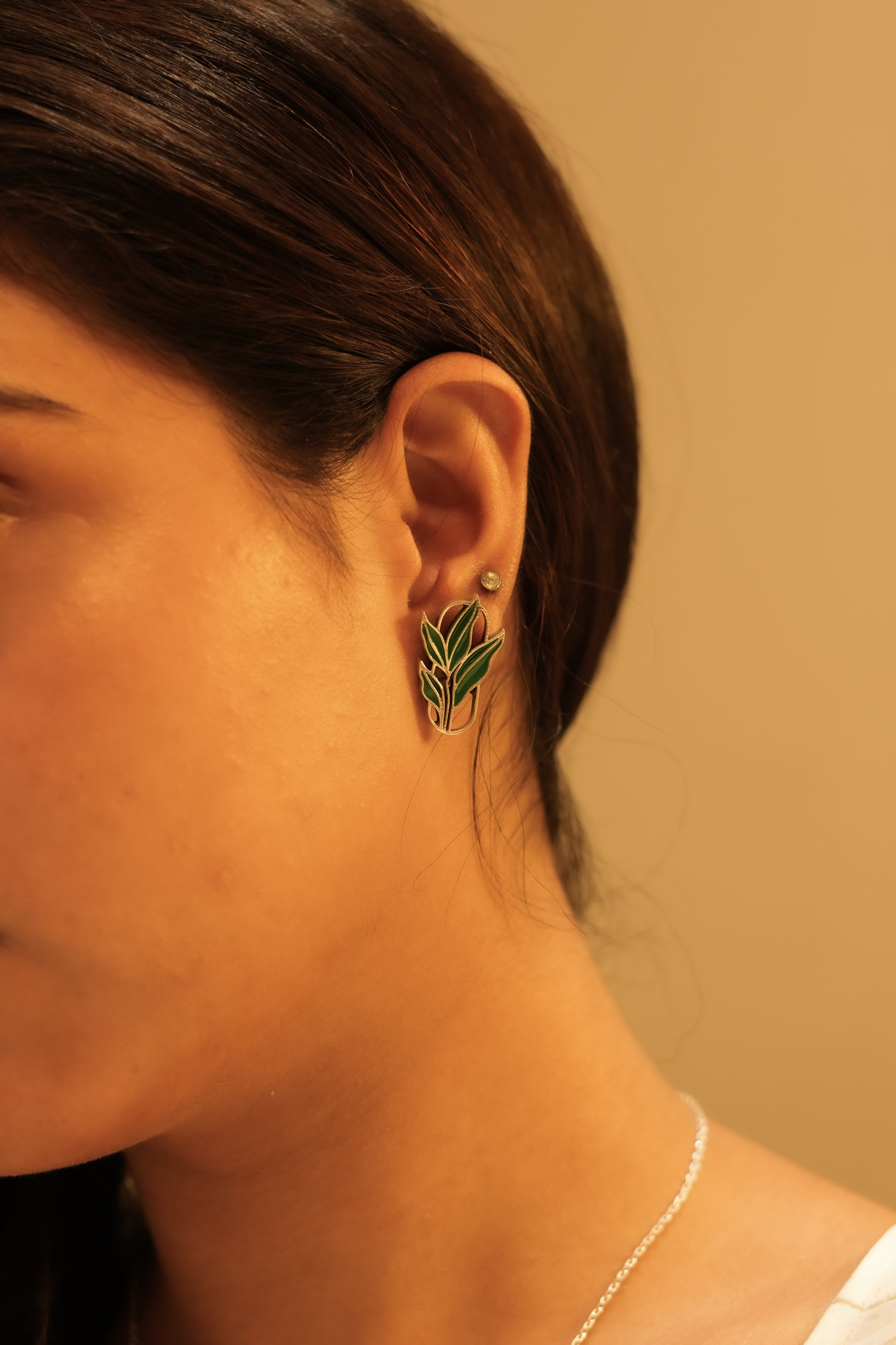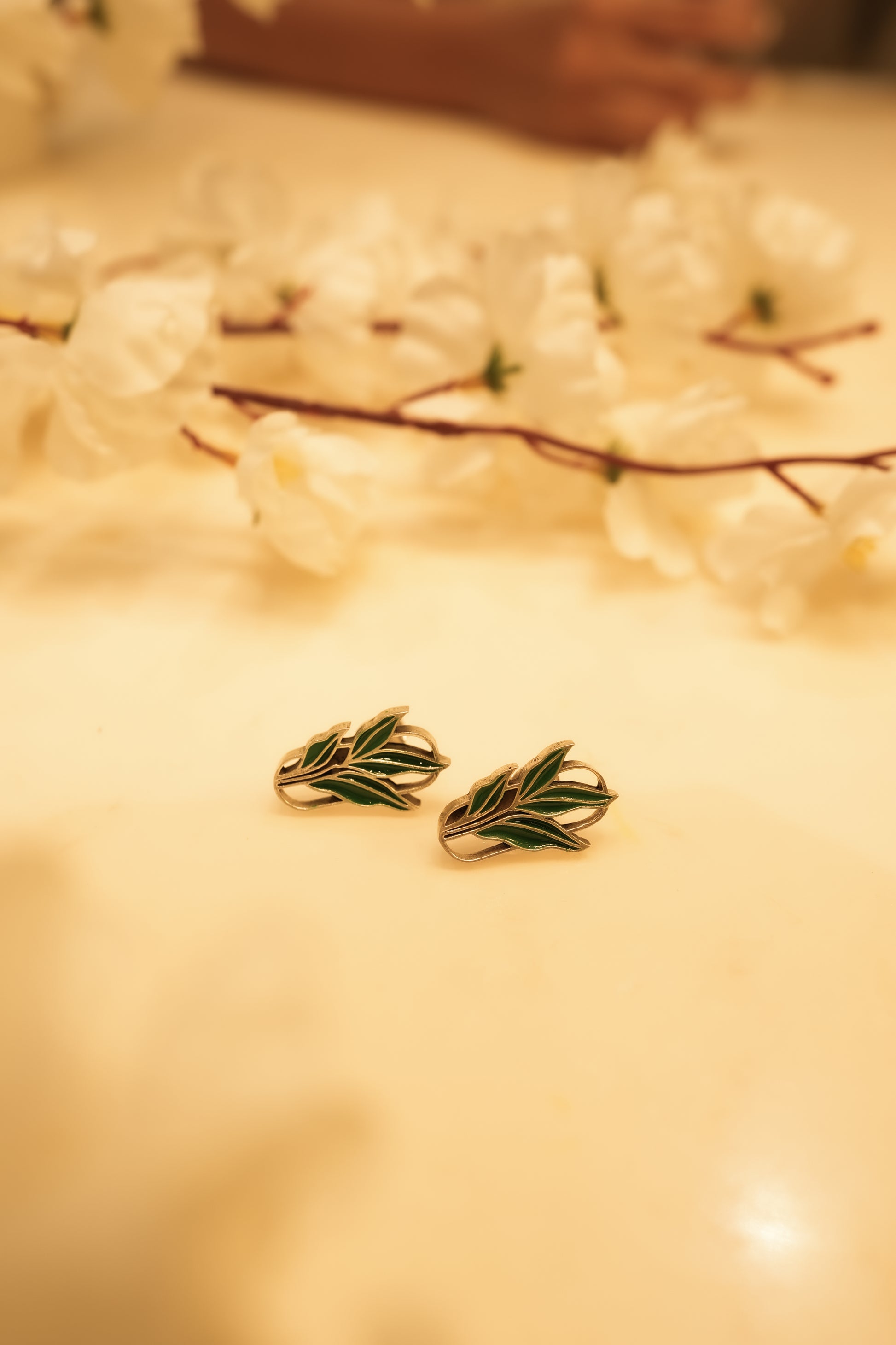 Style these with an all-white outfit or earthy tones to highlight the green enamel. Pair with the Aadhya Leaf Enamel Ring for a complete nature-inspired look.