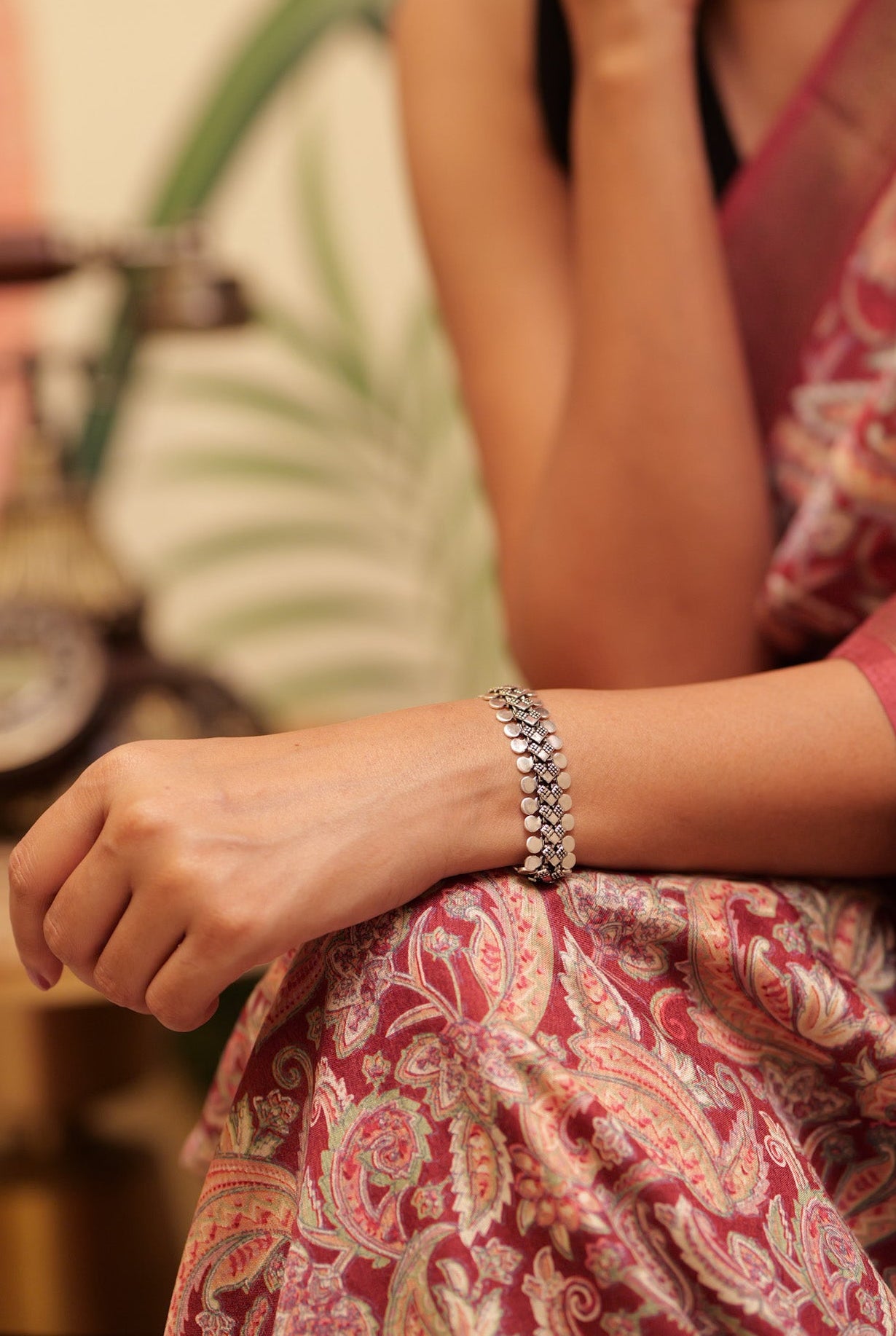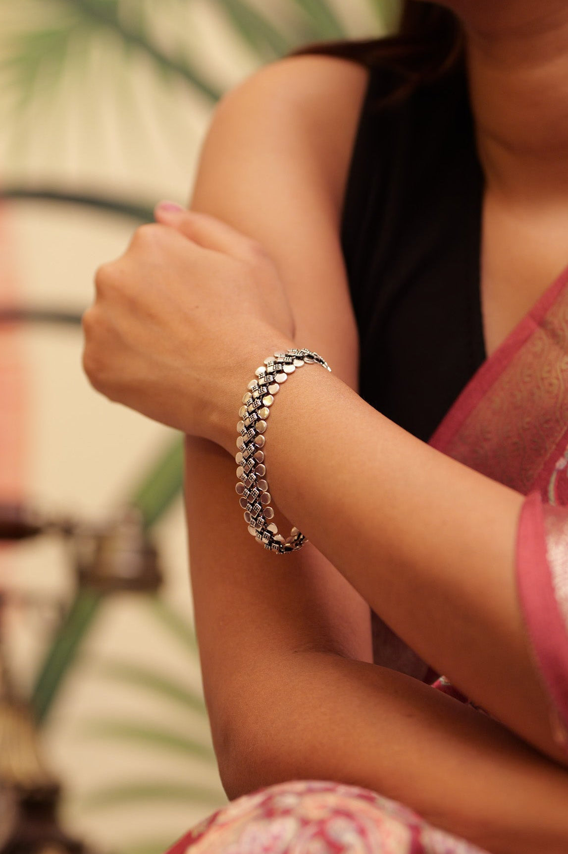 The Anaya Classic Line Arrow Bracelet is inspired by refined heritage craftsmanship blended with a modern classic touch. Its criss-cross arrow-style pattern in oxidized silver creates a striking linear design that wraps beautifully around the wrist. The bold border of rounded silver elements adds depth while keeping the look clean and timeless. Versatile and elegant, this bracelet pairs effortlessly with ethnic, casual, and Indo-Western outfits, making it a must-have addition to any jewelry collection.