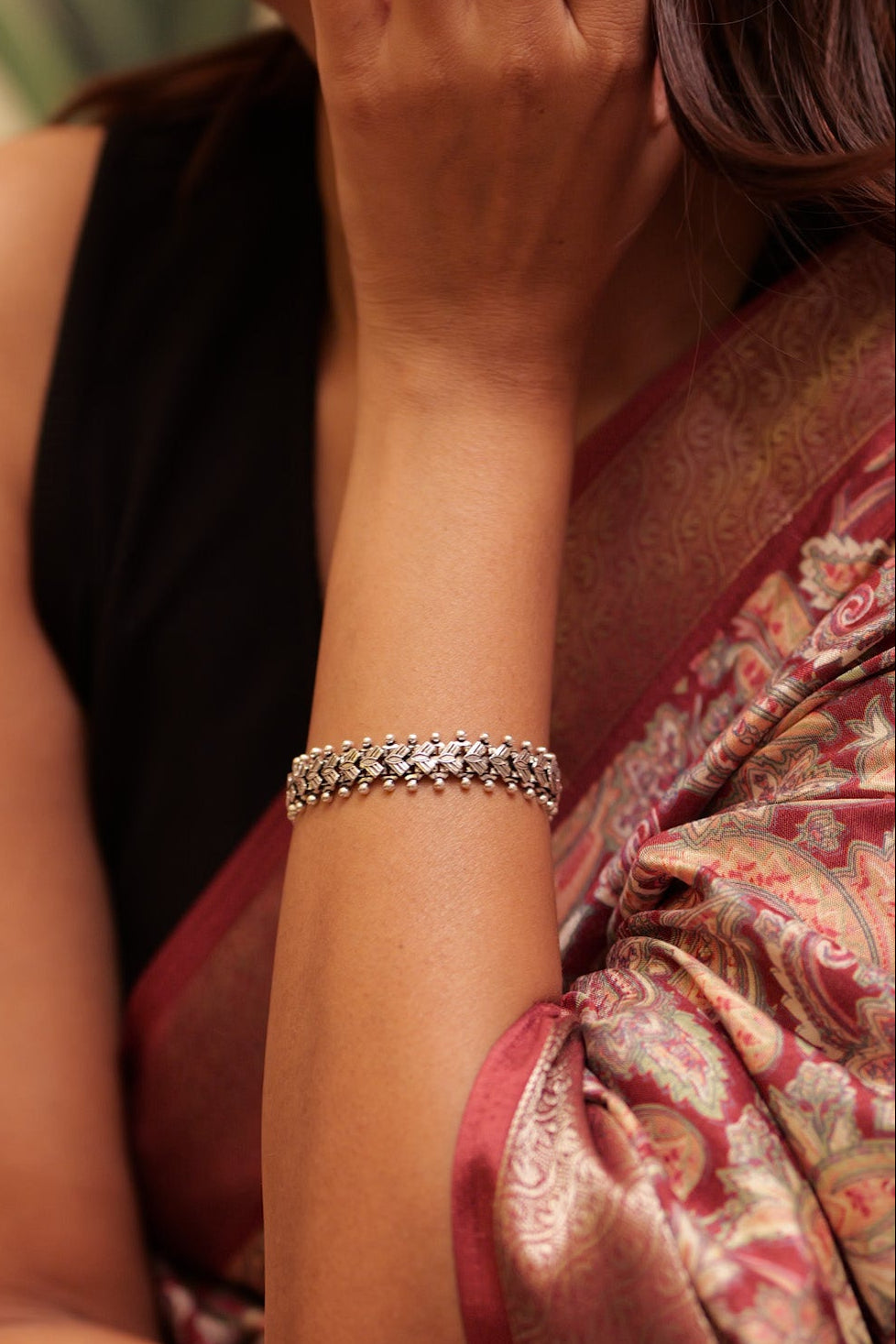 The Anaya Timeless Line Arrow Bracelet embodies subtle charm and modern-classic elegance. Designed with sleek, arrow-inspired links flowing in a clean linear pattern around the wrist, this bracelet brings together heritage-inspired motifs and contemporary minimalism. Its balanced design makes it versatile — equally at home with traditional outfits or modern dresses.