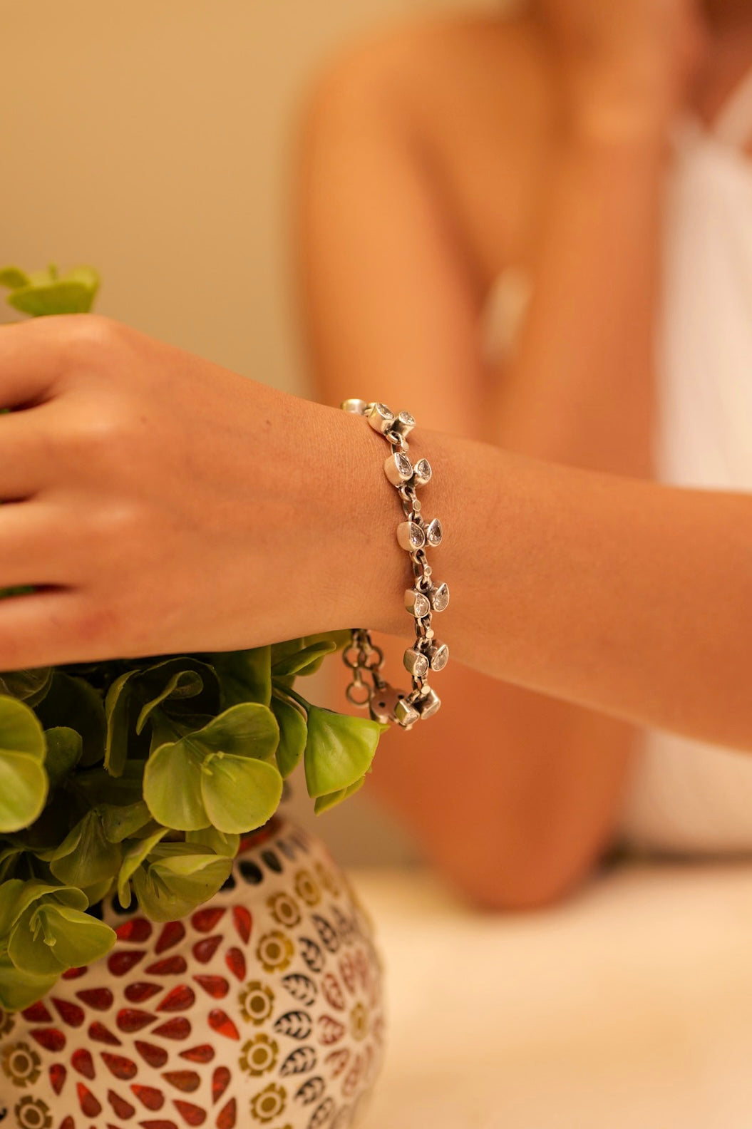 The Essence Jadau Teardrop Bracelet features a stunning row of teardrop-shaped stone settings, crafted in a classic jadau style that radiates sparkle with every movement. Elegant, lightweight, and beautifully detailed, it adds a touch of refined glamour to any look.