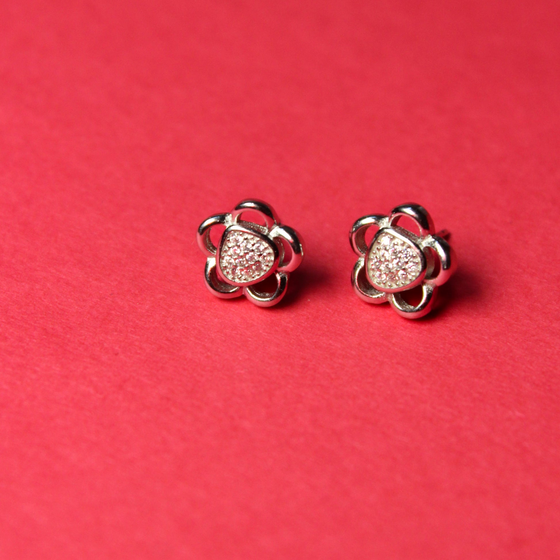 These earrings showcase a sleek flower design with open metallic petals surrounding a sparkling stone cluster at the center, blending elegance with simplicity.