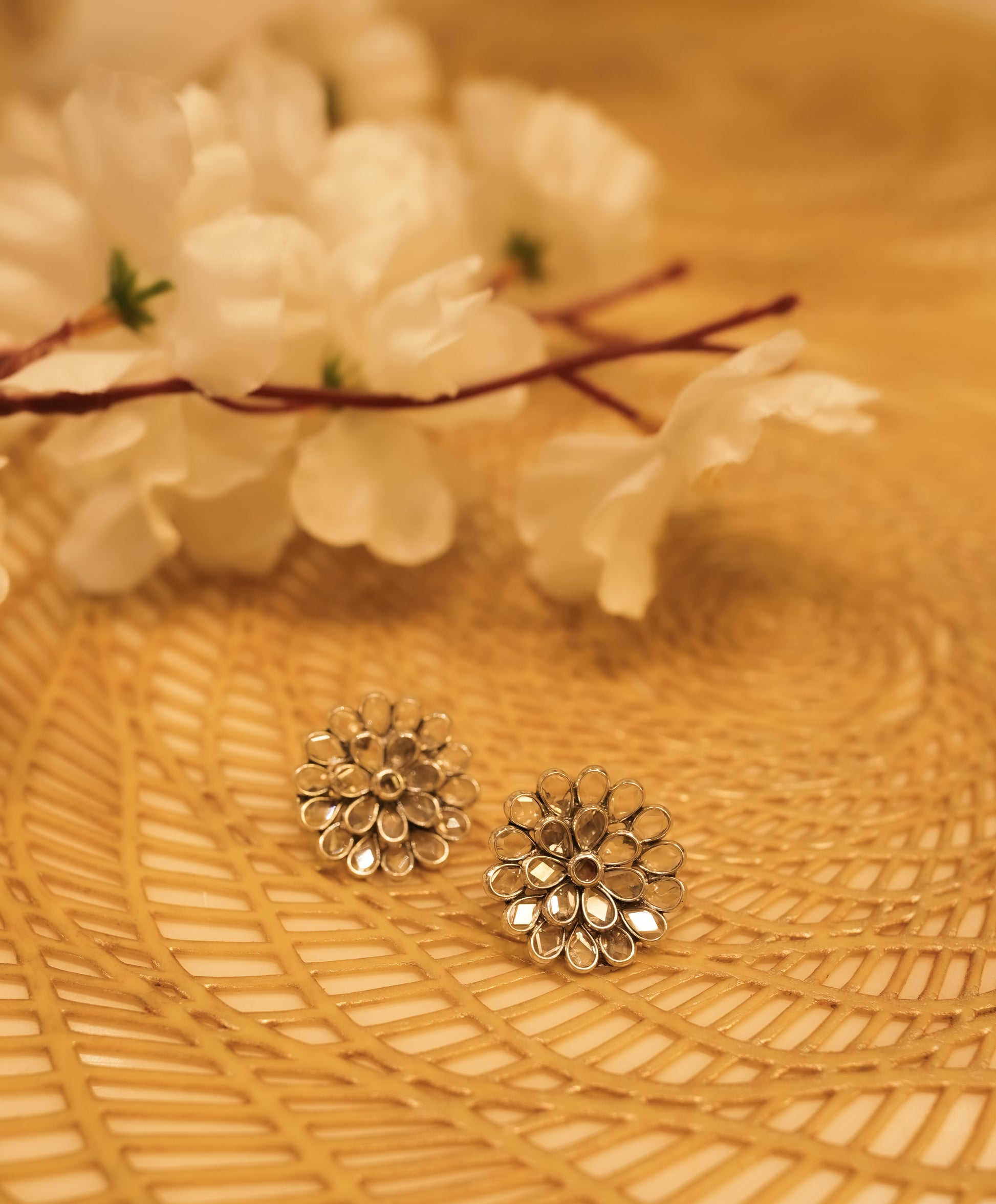 A radiant burst of elegance, this silver stud features a delicate floral design with petal-like patterns that shimmer with every turn. Handcrafted in 925 silver, its polished surface and reflective finish give it a soft twinkle — making it the perfect everyday sparkle with a timeless touch.
