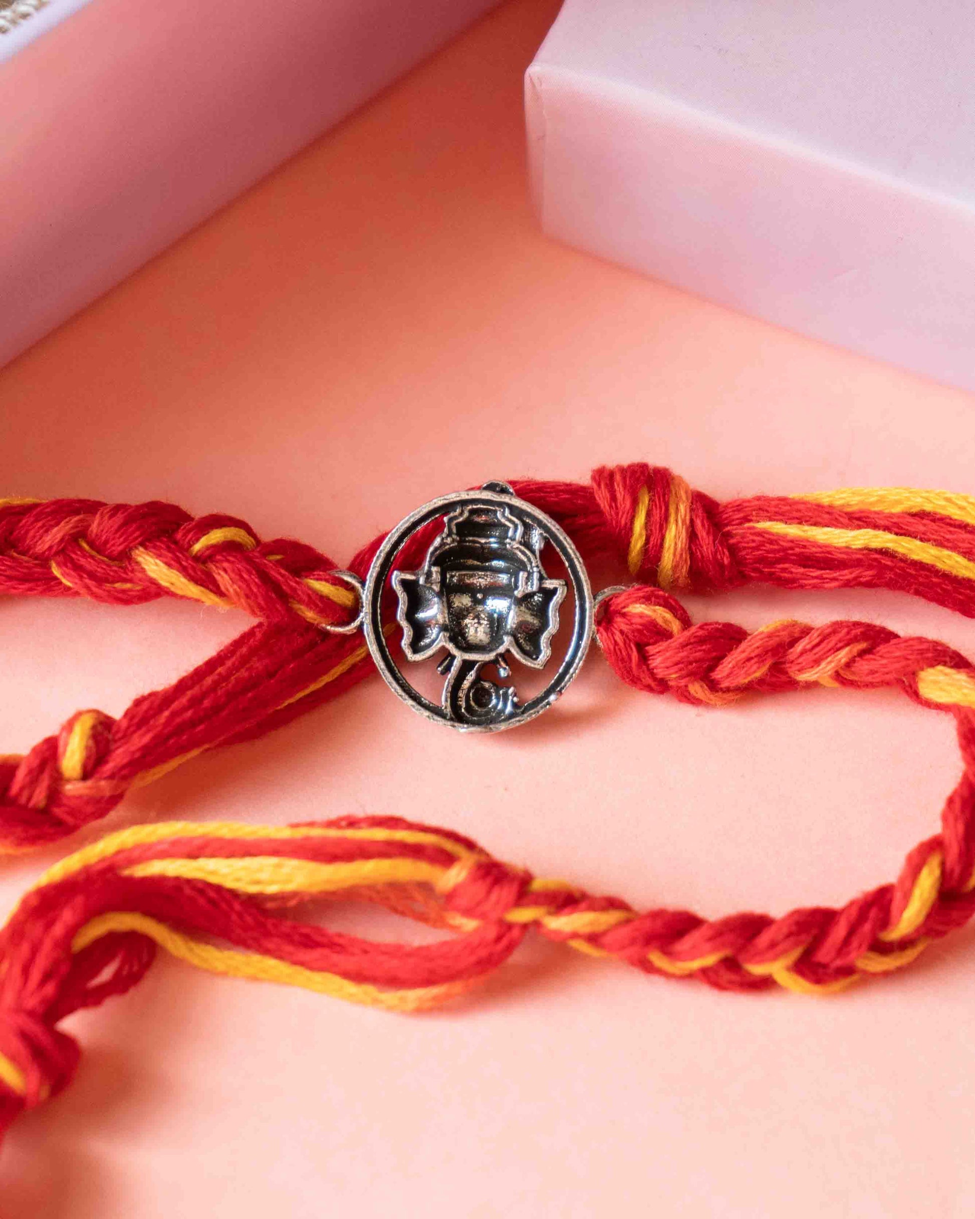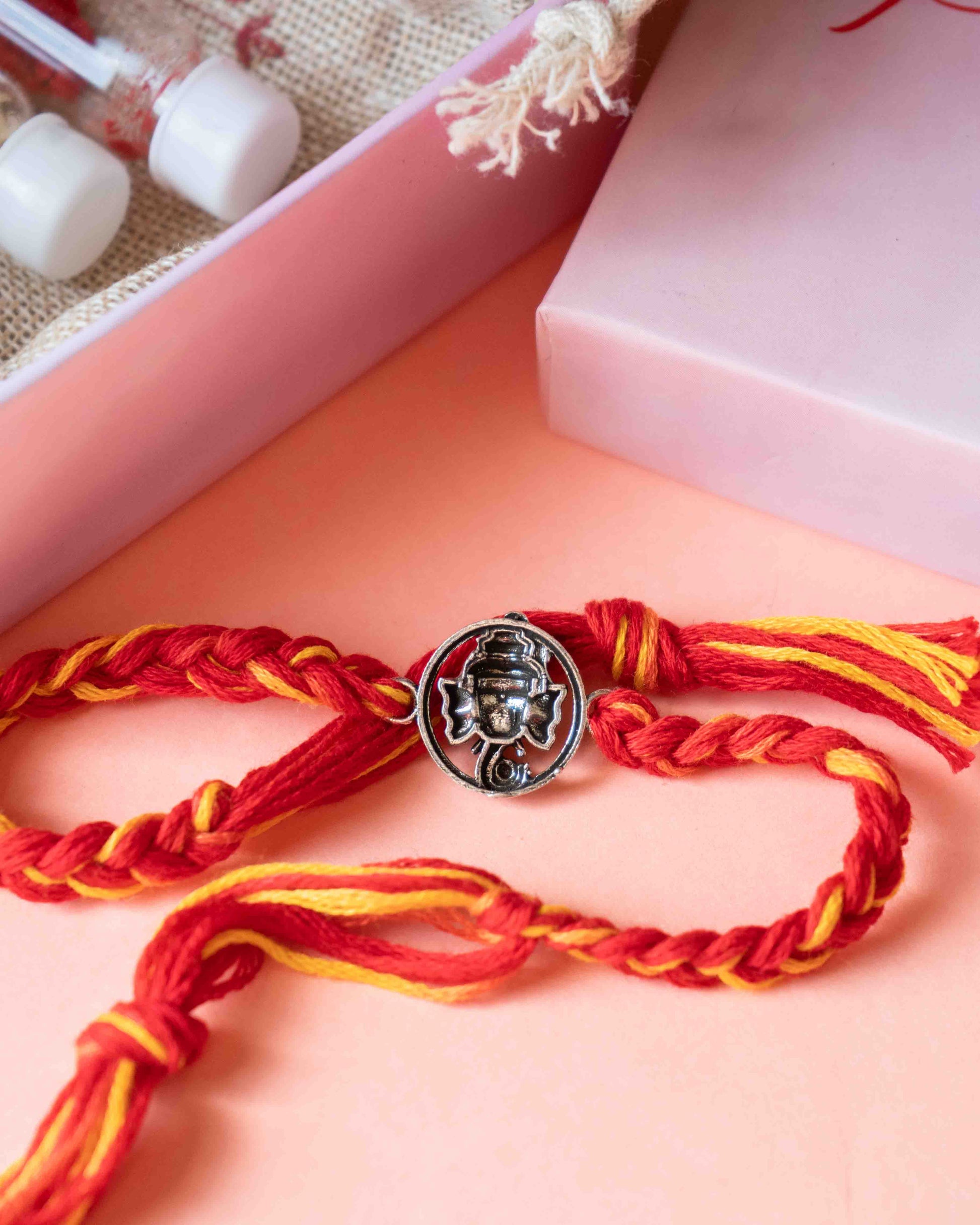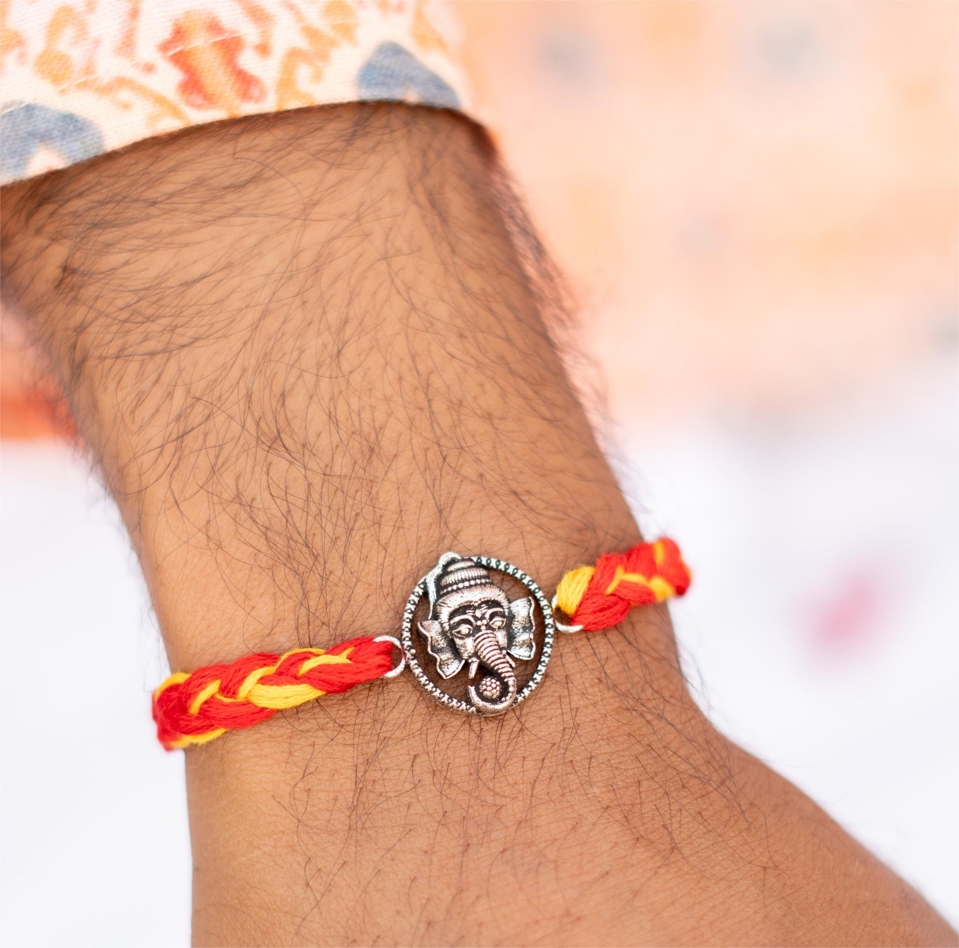 The Ganesha Blessings Rakhi is an exquisite piece handcrafted from 92.5 Sterling Silver. It features a mix of yellow and red thread strains. The packaging includes 1 rakhi, roli, chawal, and an authentication and care card. Gift your sibling this beautiful rakhi on Raksha Bandhan. Later the center motif can be used for making a bracelet by changing the thread.