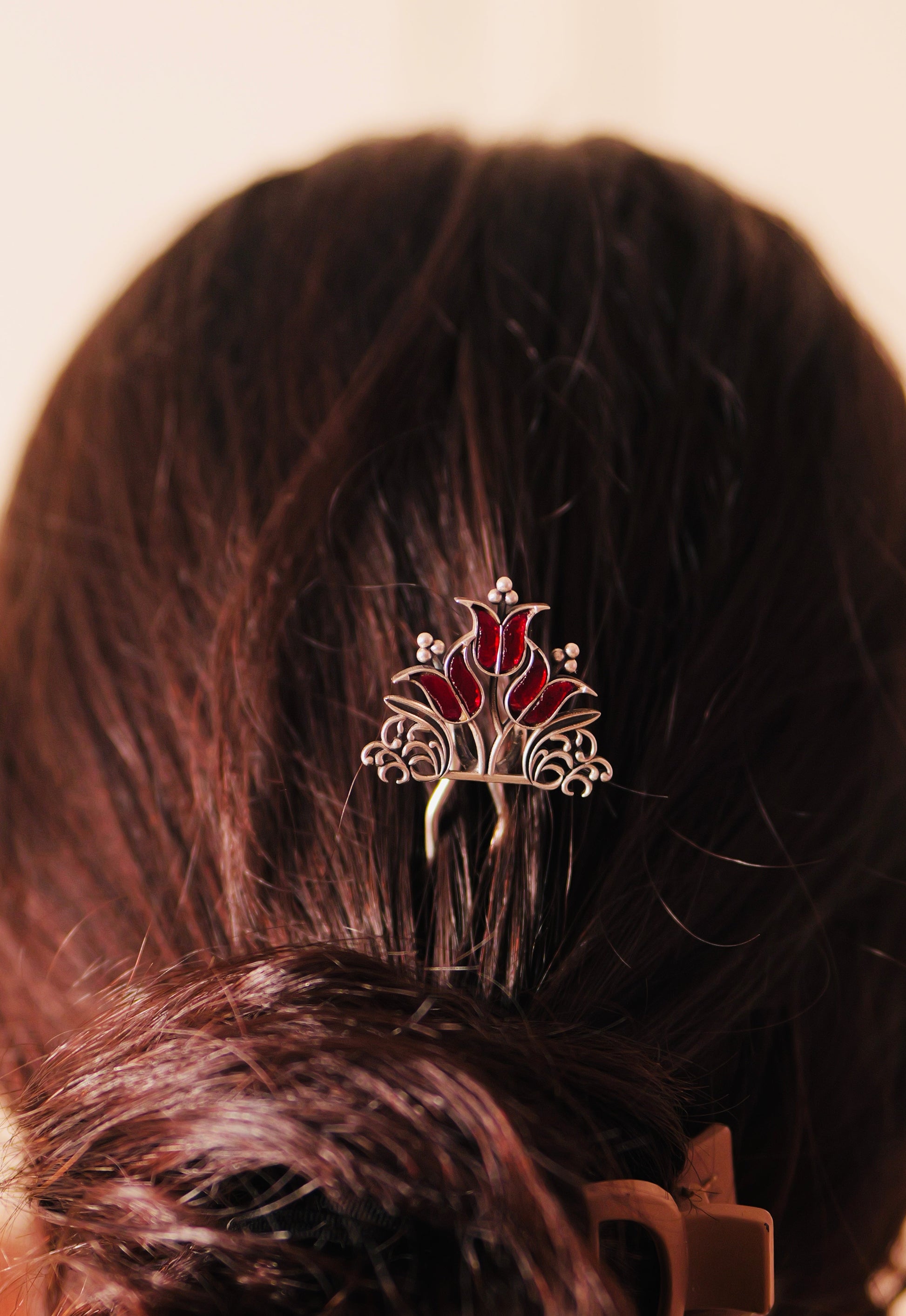 The Mishi Kundan Tulip Ruby Juda Pin showcases a stunning tulip-inspired motif adorned with ruby enamel and delicate kundan accents. Expertly handcrafted in silver, this timeless piece captures the essence of elegance and artistry. Ideal for traditional buns and festive hairstyles, its antique finish and graceful curves bring a royal charm to every look.