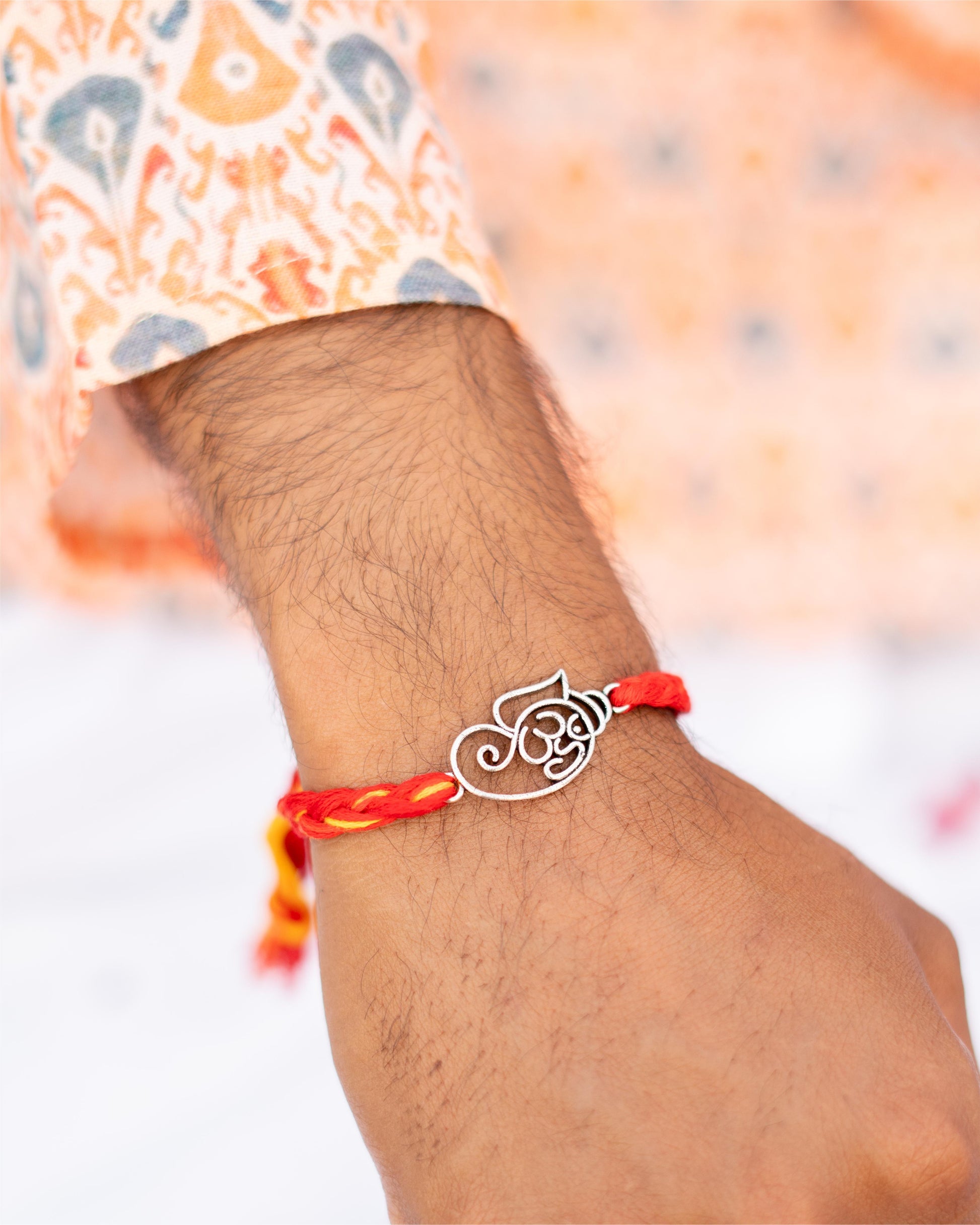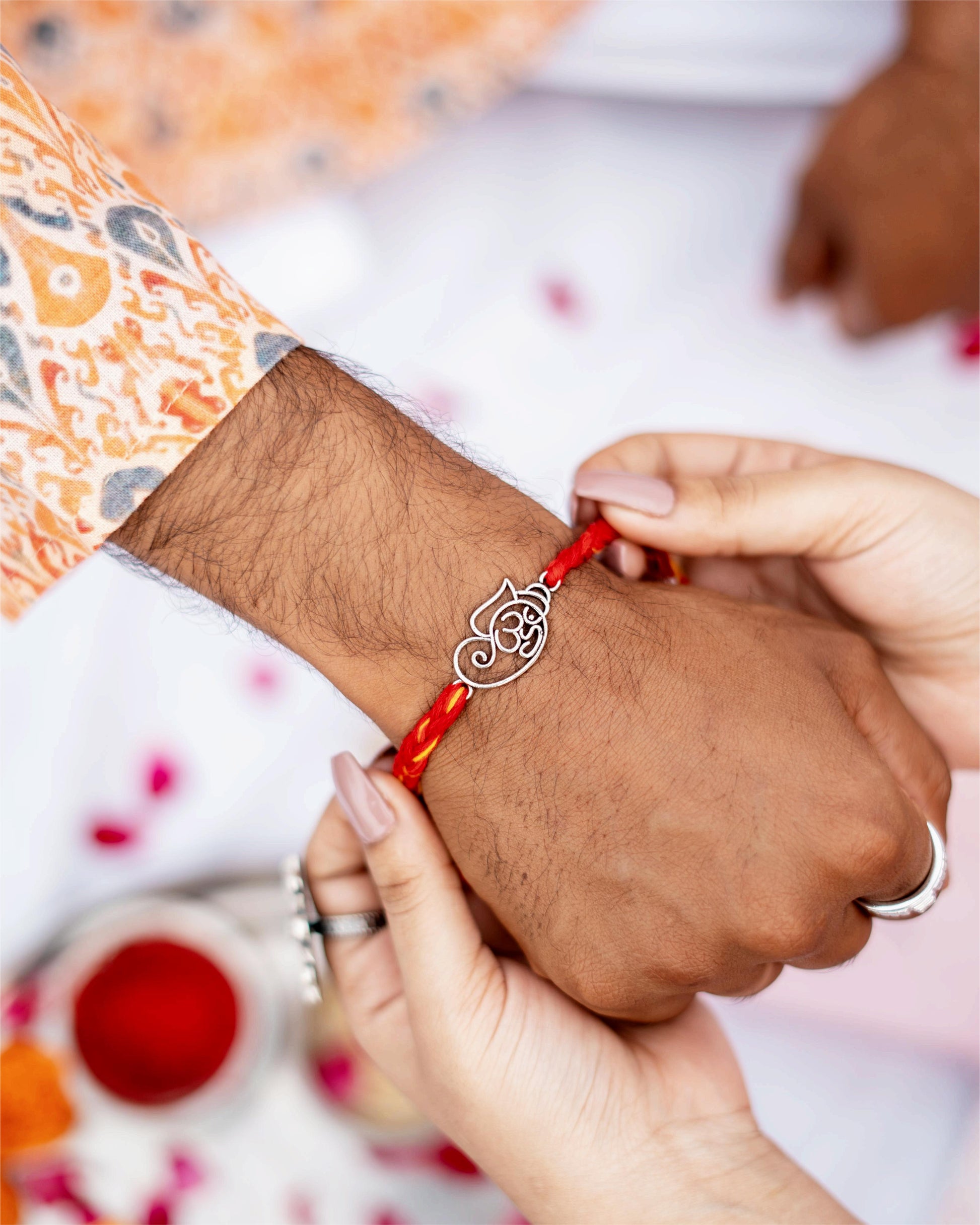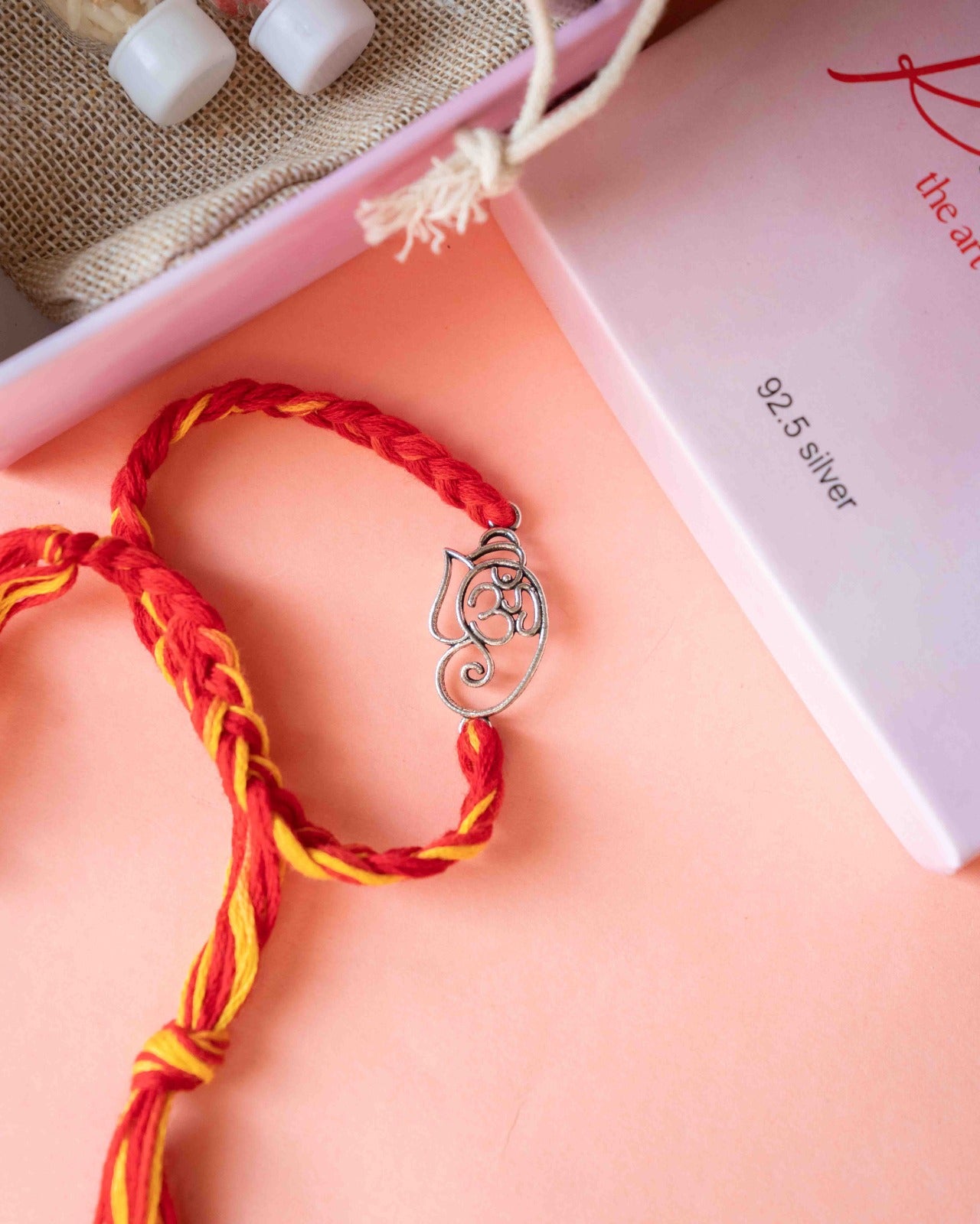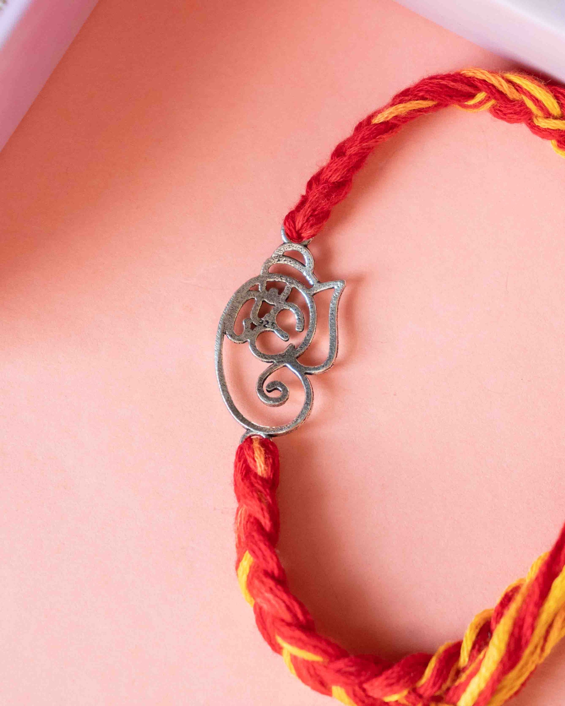 The Om Shree Ganesh Rakhi is an exquisite piece handcrafted from 92.5 Sterling Silver. It features a mix of yellow and red thread strains. The packaging includes 1 rakhi, roli, chawal, and an authentication and care card. Gift your sibling this beautiful rakhi on Raksha Bandhan. Later the center motif can be used for making a bracelet by changing the thread.