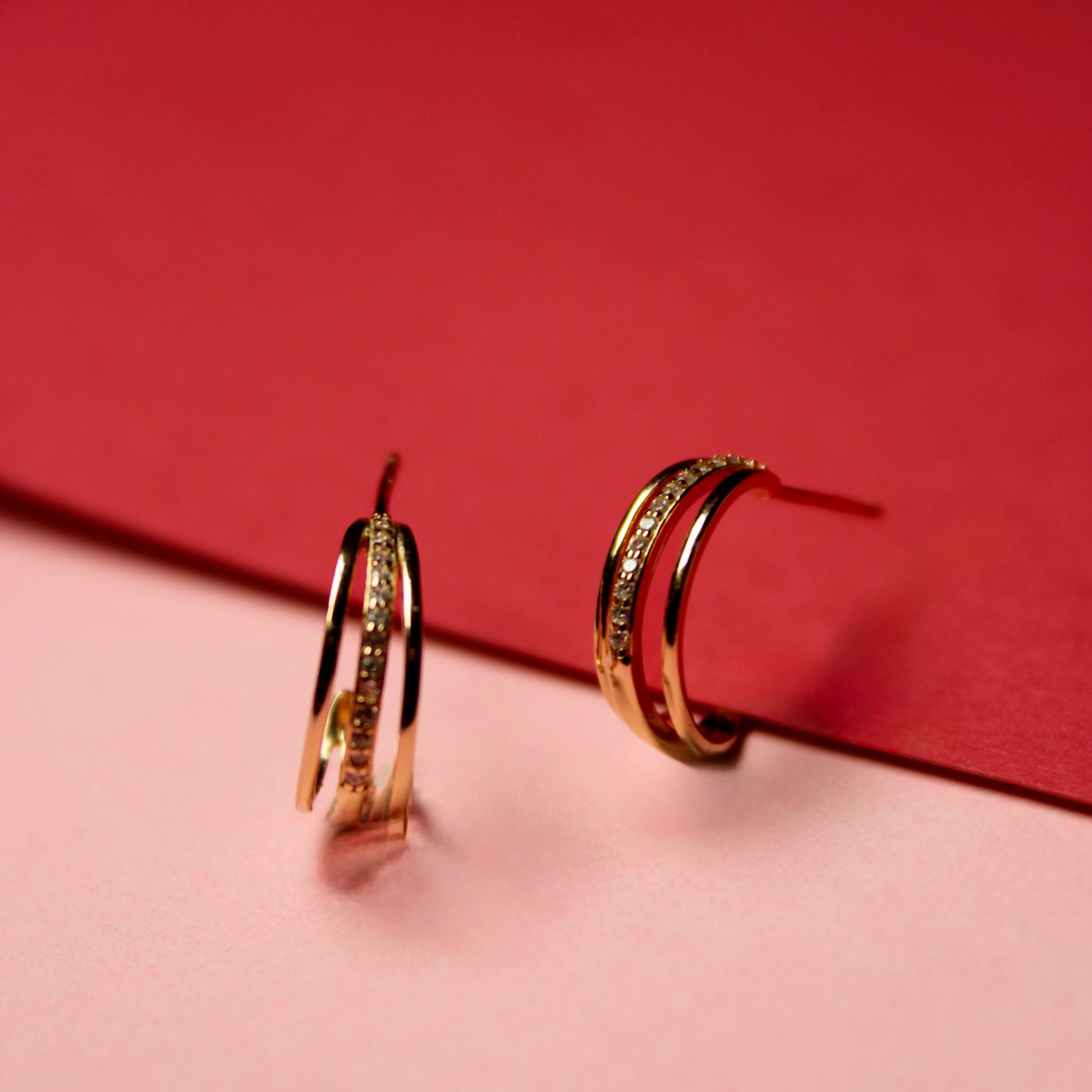 A sleek double-band hoop earring with one band featuring small embedded stones for a subtle sparkle, creating a modern and minimalist look.