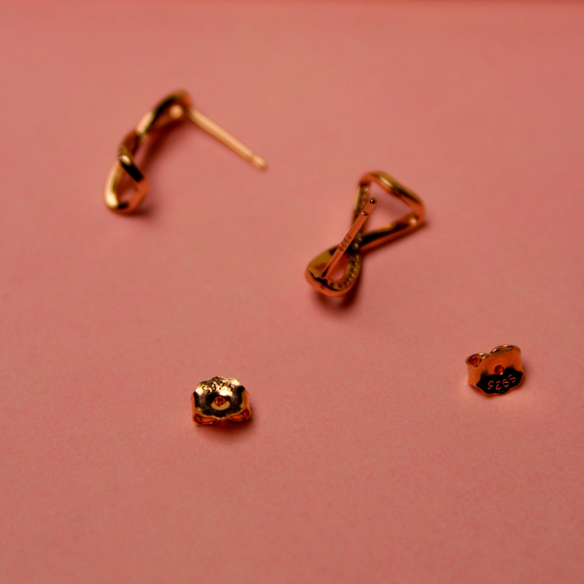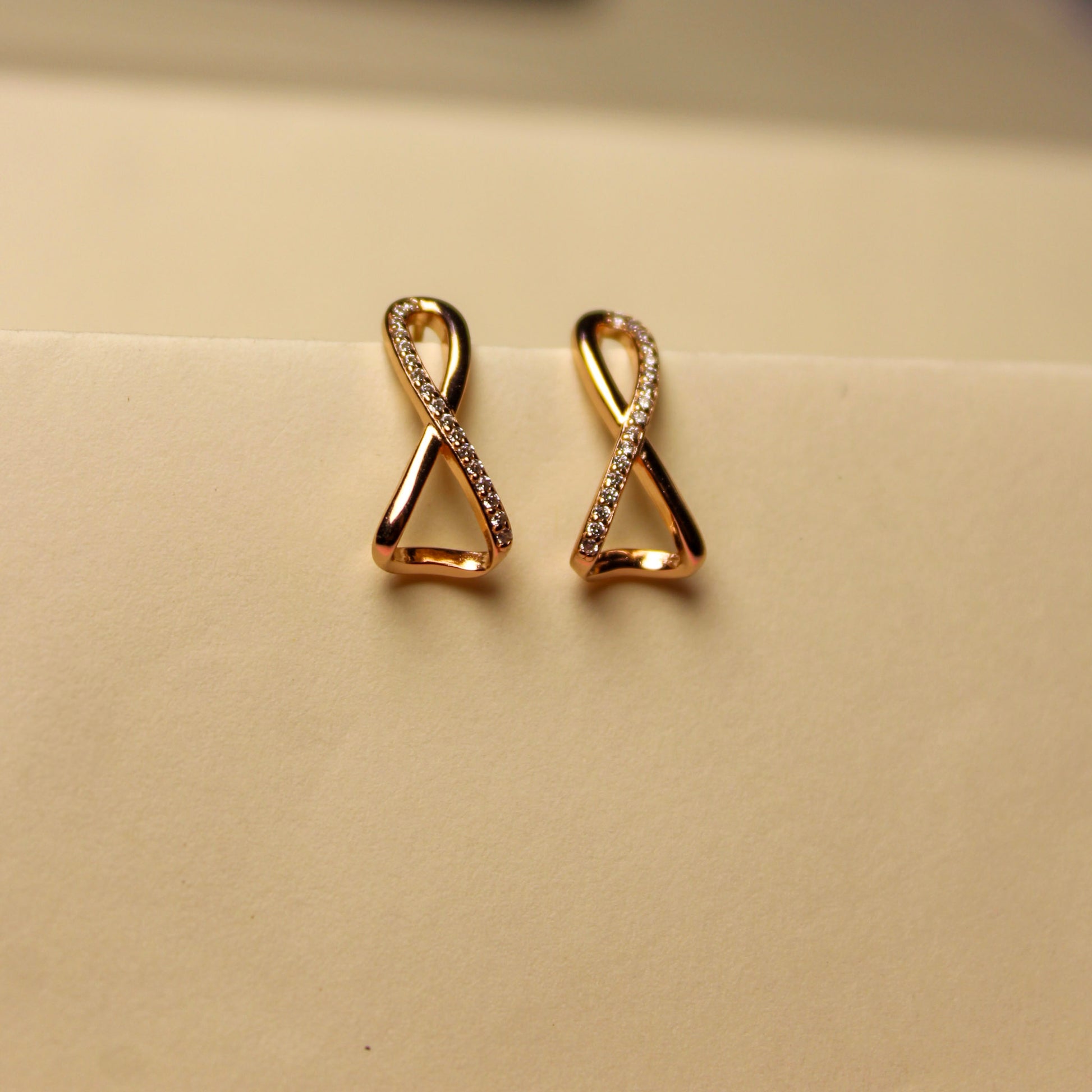 These earrings showcase a twisted infinity loop design, with one side accented by delicate zircons, creating a modern and elegant look.
