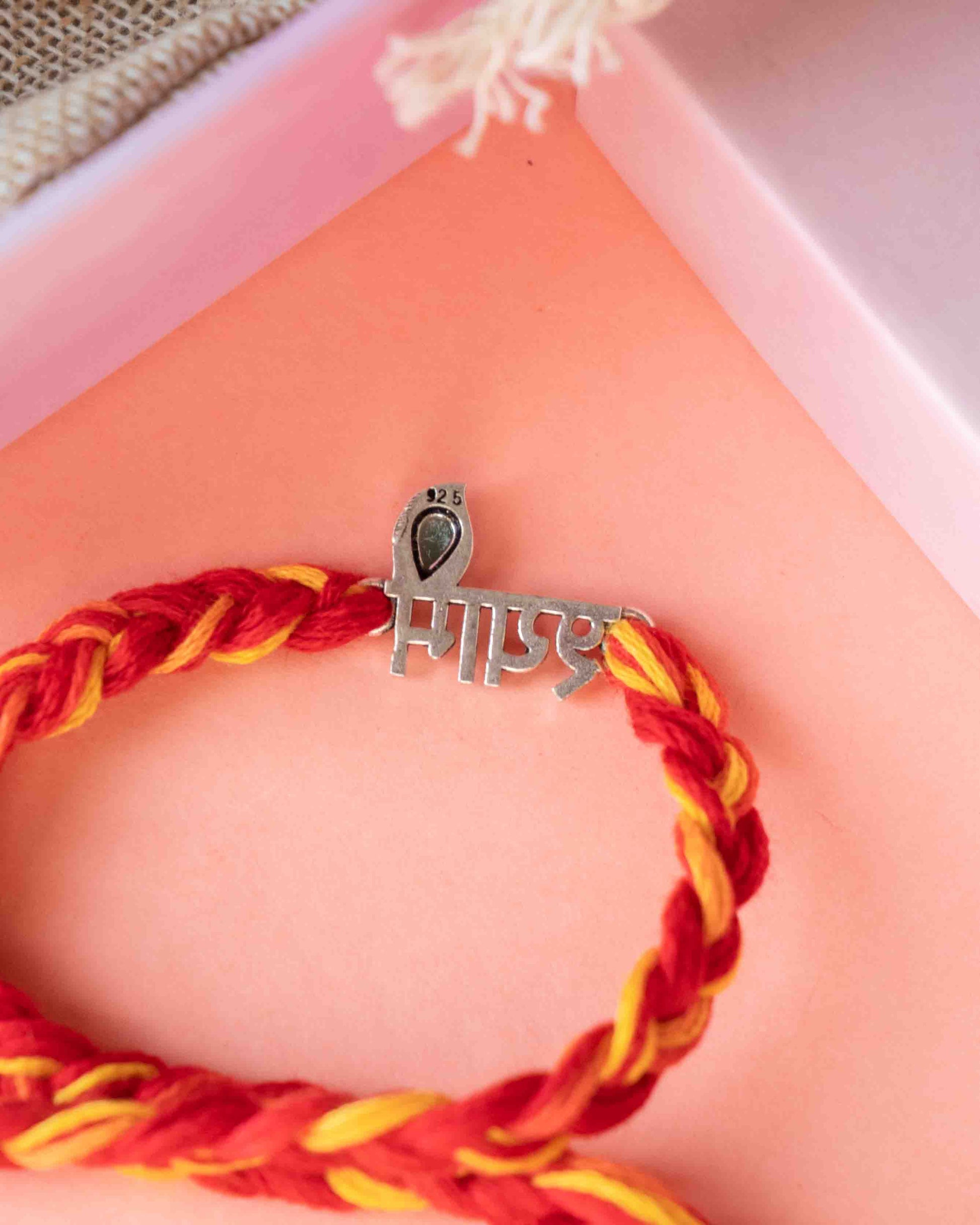 The Shyam Blessings Rakhi is an exquisite piece handcrafted from 92.5 Sterling Silver. It features a mix of yellow and red thread strains. The packaging includes 1 rakhi, roli, chawal, and an authentication and care card. Gift your sibling this beautiful rakhi on Raksha Bandhan. Later the center motif can be used for making a bracelet by changing the thread.