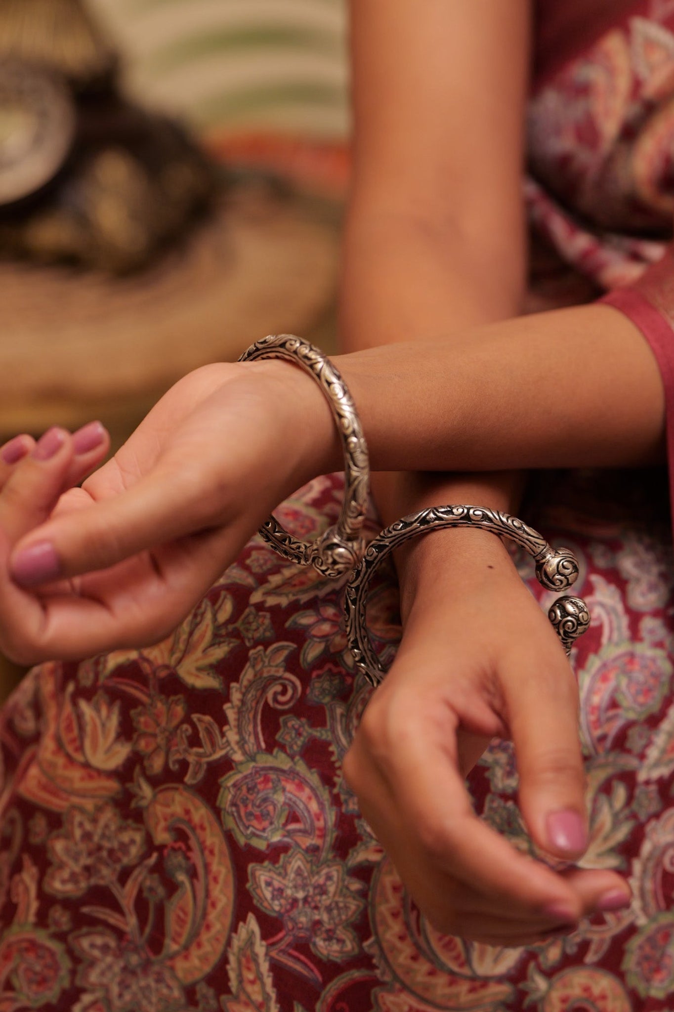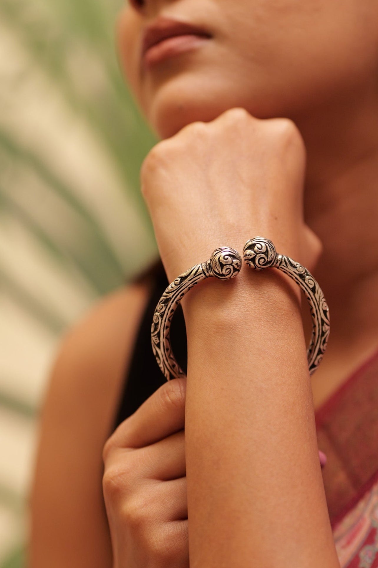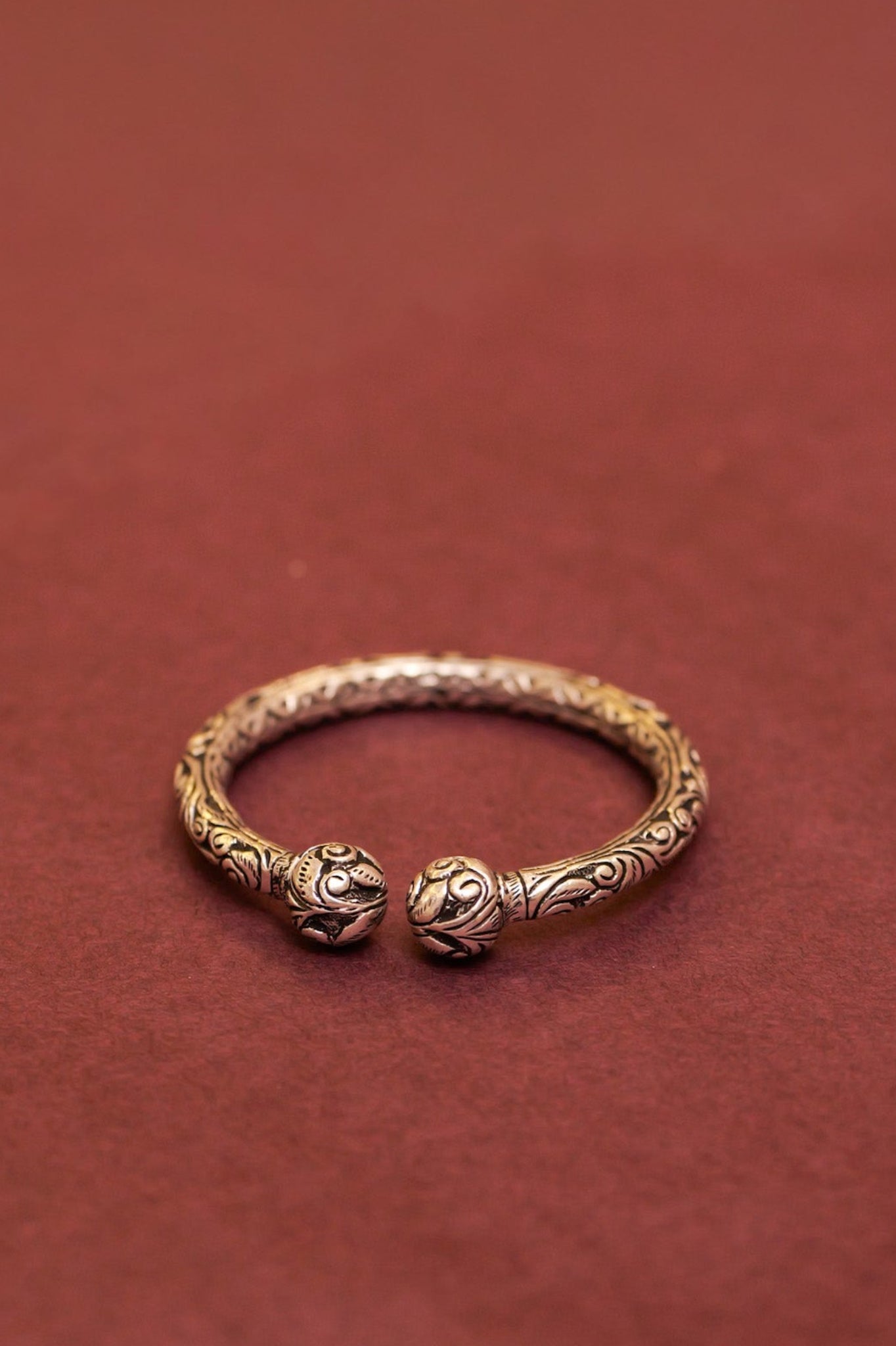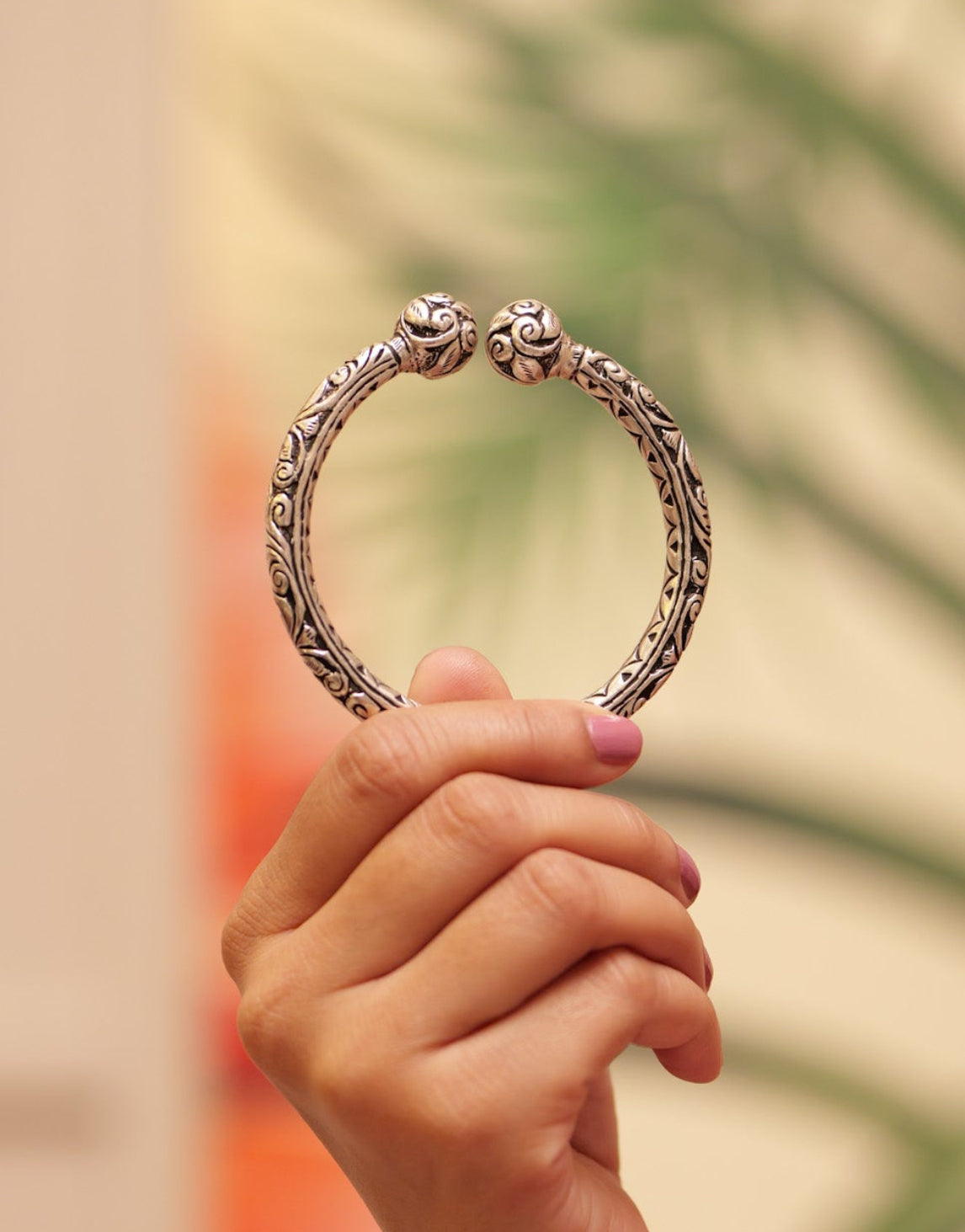 The Tattva Chitai Twin Ball Kada blends heritage craftsmanship with bold contemporary elegance. Featuring intricate chitai carving across the band and two ornate oxidised ball ends, it carries a rich handcrafted appeal that instantly elevates any look. Solid, detailed and full of character, this kada is made for those who love jewellery that speaks tradition with a modern edge.
