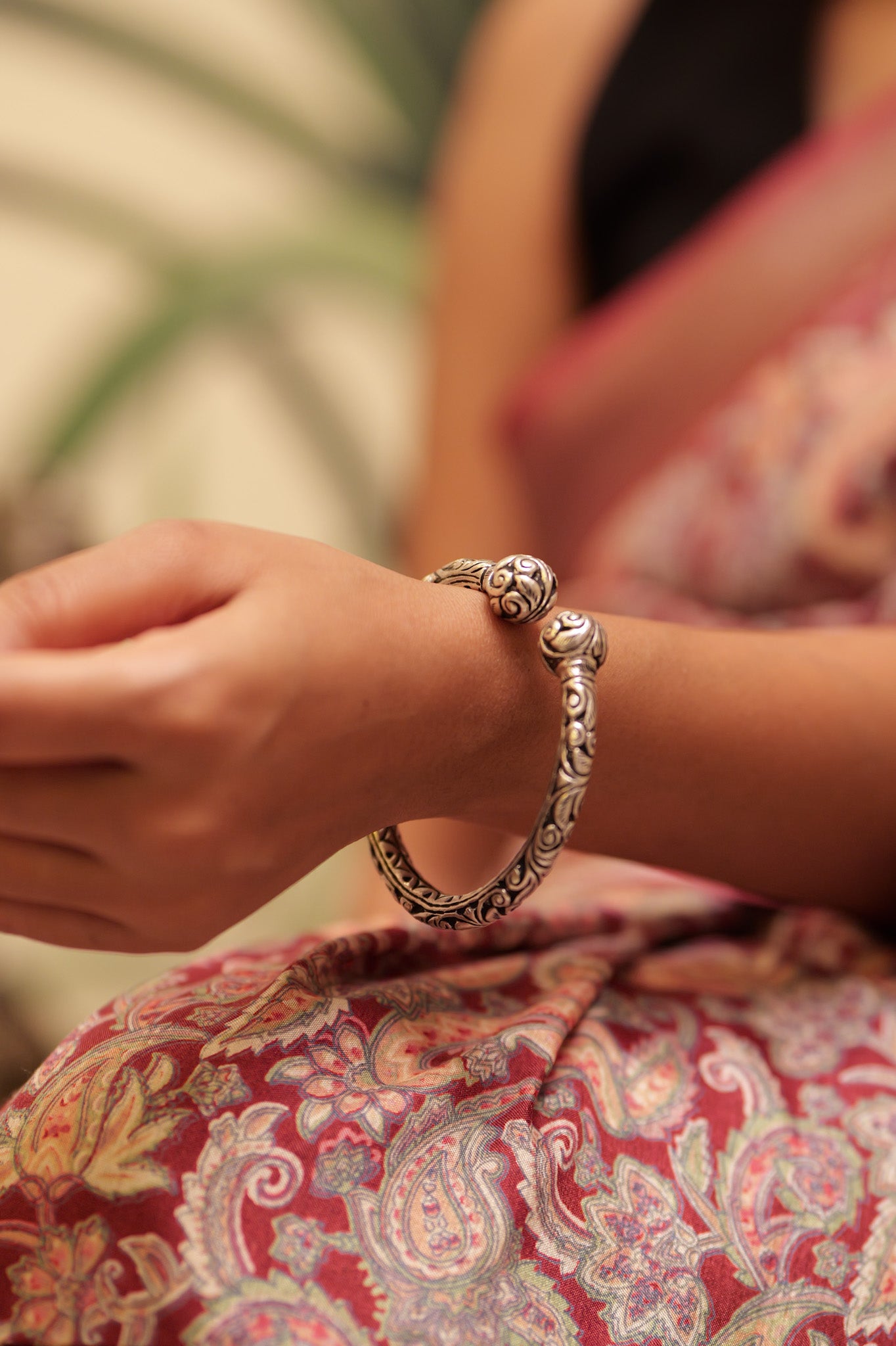 Wear it with ethnic fits like sarees, lehengas and kurtas for festive charm, or let it stand out against western styles like denim jackets, dresses or co-ord sets for a striking Indo-fusion statement. Style it solo for a classy impact or stack it with sleek silver kadas for a layered power look.