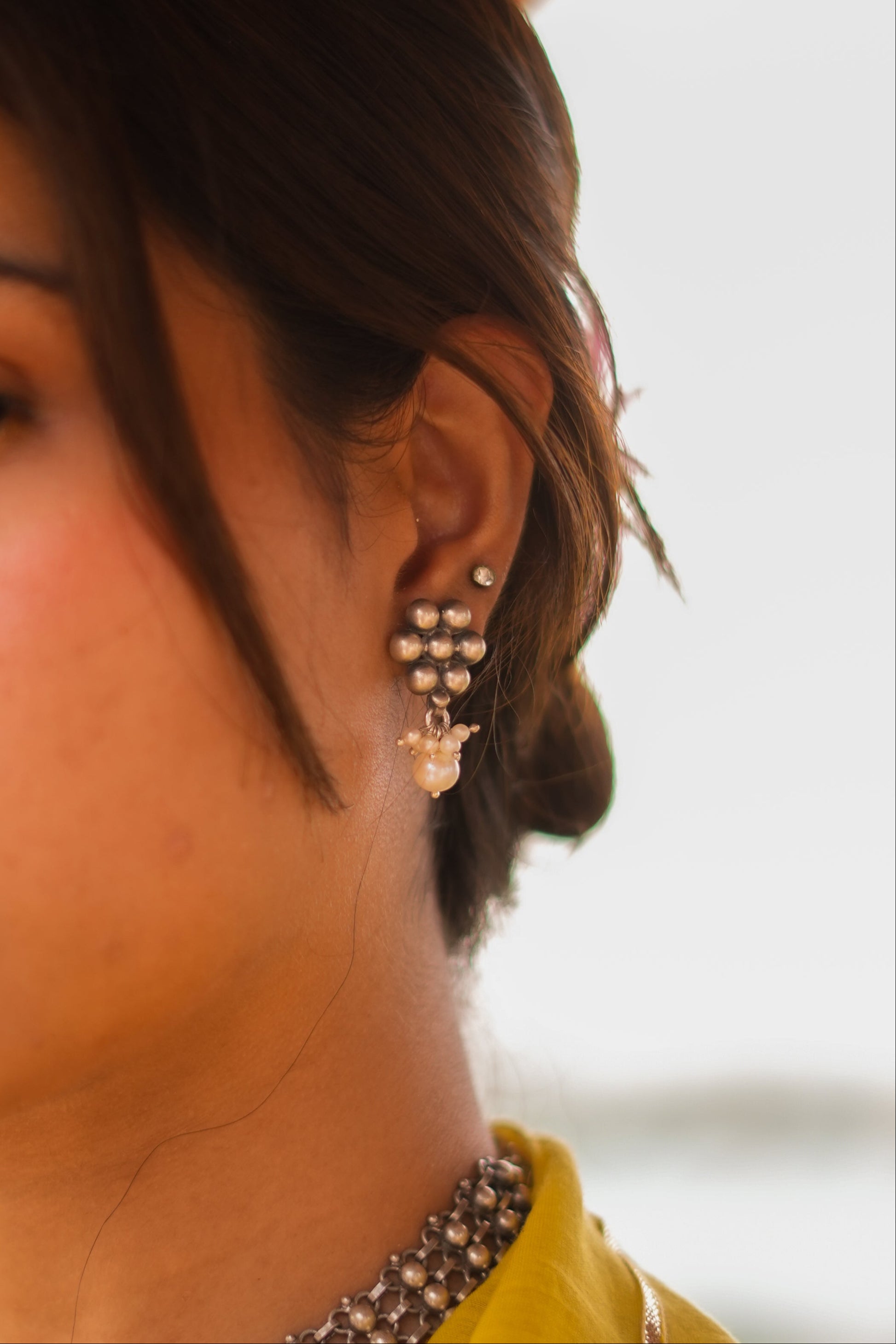 These oxidized silver earrings feature a graceful cluster of pearl-like beads, giving them a soft, traditional charm. Their design is both intricate and timeless—perfect for pairing with ethnic outfits. The earrings strike a beautiful balance between statement and subtlety, making them suitable for festive as well as semi-formal occasions.